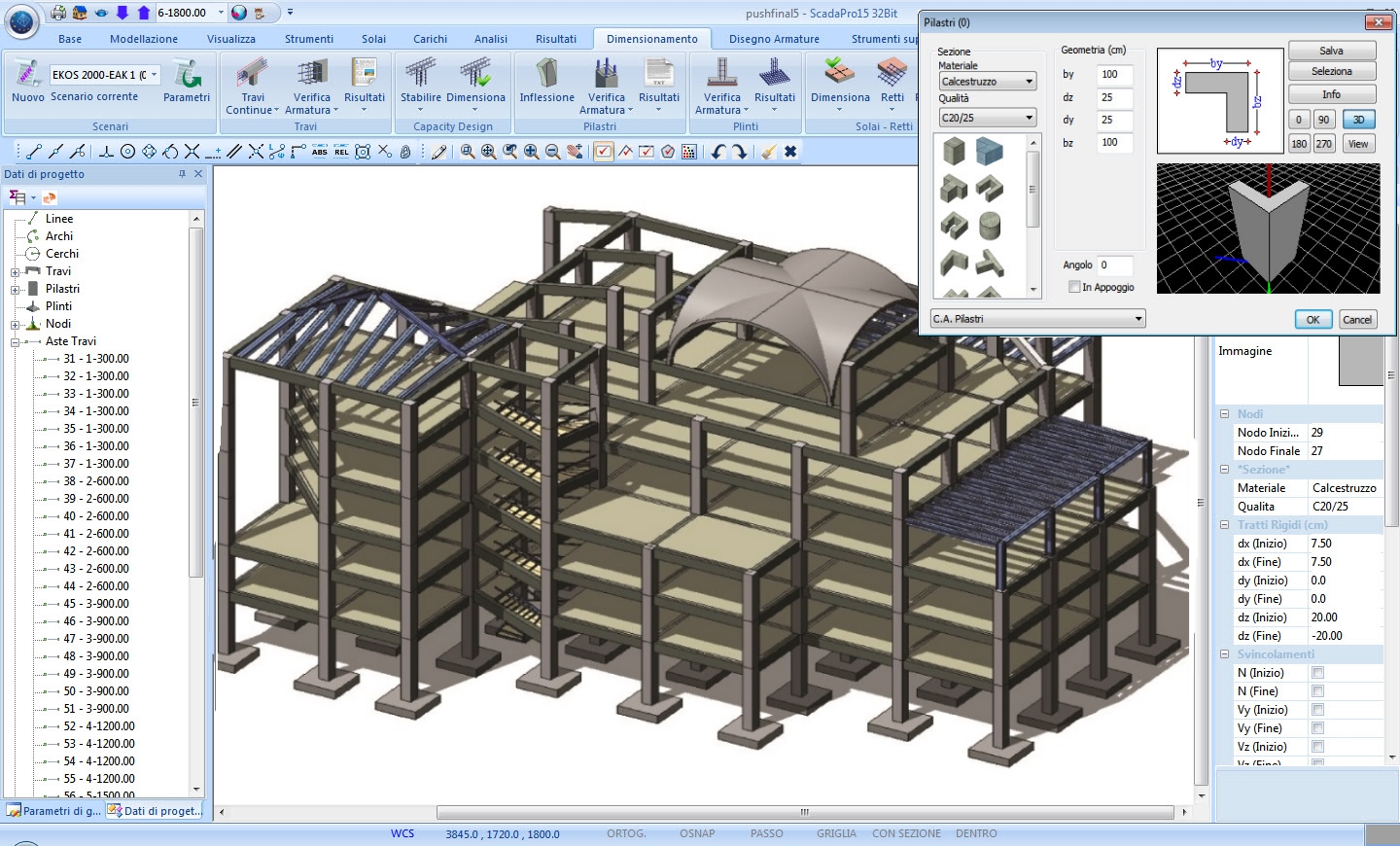 Il riconoscimento e la simulazione delle sezioni dalla libreria di SCADA Proavviene selettivamente o automaticamente per livello, per elemento (colonne, travi, travi di fondazione) o per l’intera struttura.
